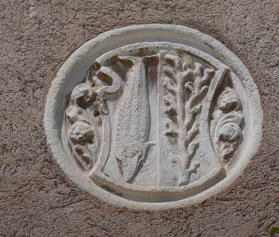 En el edificio de la torre, encontramos un tondo con la letra B, y otro con un delfín, símbolo cristológico, y el Árbol de la Vida que seguramente pertenecieron a Ca' Bontremolo.